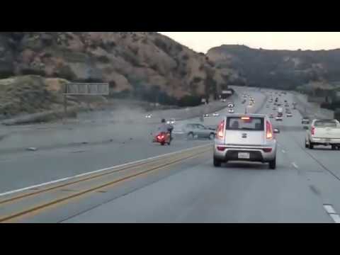 -- A motorcyclist kicked at a car driving on a southern California freeway in an apparent case of road rage touching off a chain reaction crash that ended in a. As California Highway Patrol investigators search for a motorcyclist who kicked a sedan and then throttled away as an explosive chain-reaction collision left two vehicles wrecked and one man. -- A video of a motorcycle rider kicking his leg at a car along the 14 Freeway in Santa Clarita in an apparent case of road rage triggering a chain-reaction crash went viral.